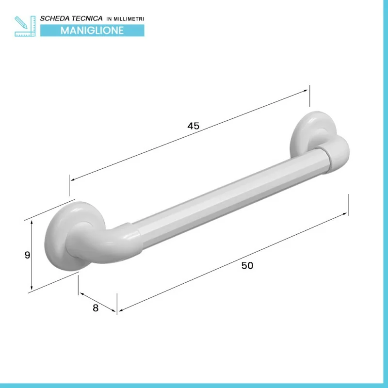 Il maniglione è realizzato in ABS resistente,capace di garantire una portata massima fino a 120 kg;i dettagli zigrinati del corrimano svolgono una valida funzione antiscivolo,per aggrapparsi senza esercitare pressione. I maniglioni sono disponibili in diverse misure,con un design minimal che li rende adatti a qualsiasi tipo di arredo.