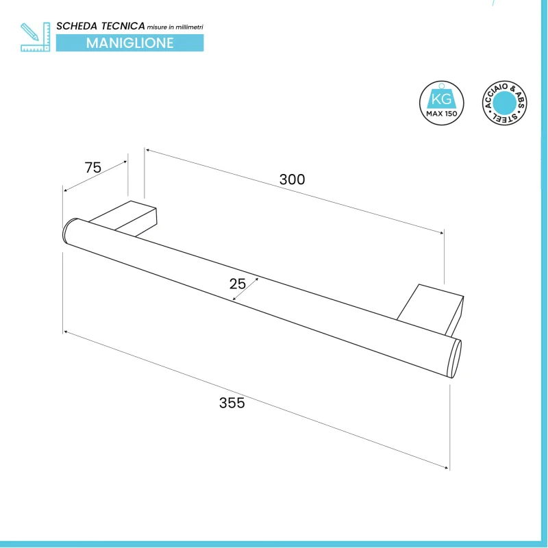 Un sostegno sicuro che conferisce serenità e autonomia nel quotidiano. Con un interasse di 30 cm e una lunghezza totale di 35,5 cm, rappresenta un ausilio fondamentale per anziani, disabili e chiunque presenti difficoltà motorie. Questo maniglione corrimano in acciaio inossidabile cromo, con la sua impugnatura ergonomica e dal design moderno e raffinato con rosoni rettangolari, offre un appoggio affidabile e confortevole, con una portata massima di 150 kg.