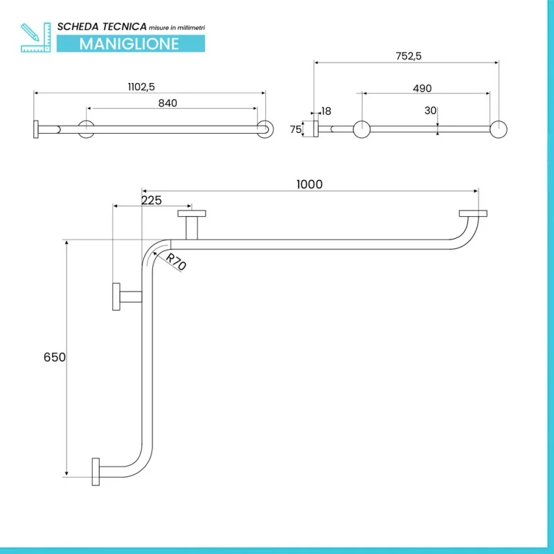 Maniglione angolare bagno 65x100 in acciaio bianco con fissaggi a muro Maniglione angolare bagno 65x100 in acciaio bianco con fissaggi a muro