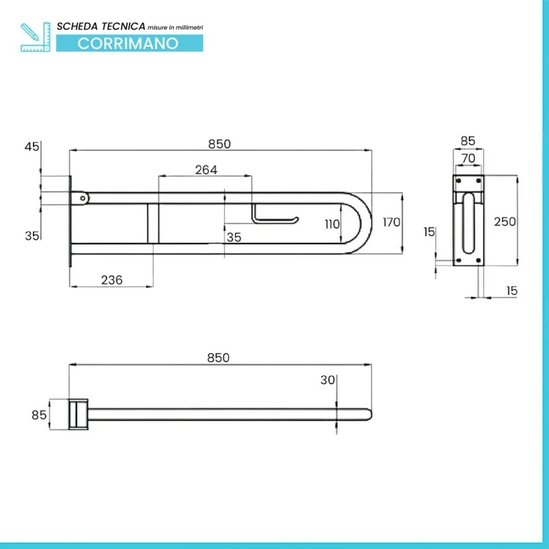 Barra di sostegno ribaltabile 85 cm in acciaio bianco con porta rotolo Barra di sostegno ribaltabile 85 cm in acciaio bianco con porta rotolo scheda tecnica