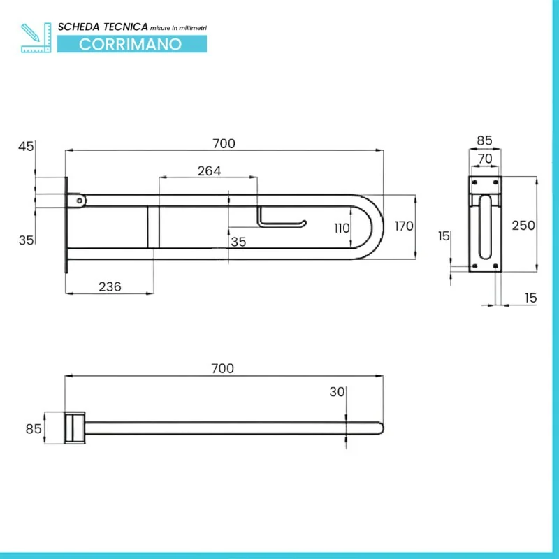Barra di sostegno ribaltabile per disabili 70 cm in acciaio bianco con porta rotolo Barra di sostegno ribaltabile per disabili 70 cm in acciaio bianco con porta rotolo scheda tecnica