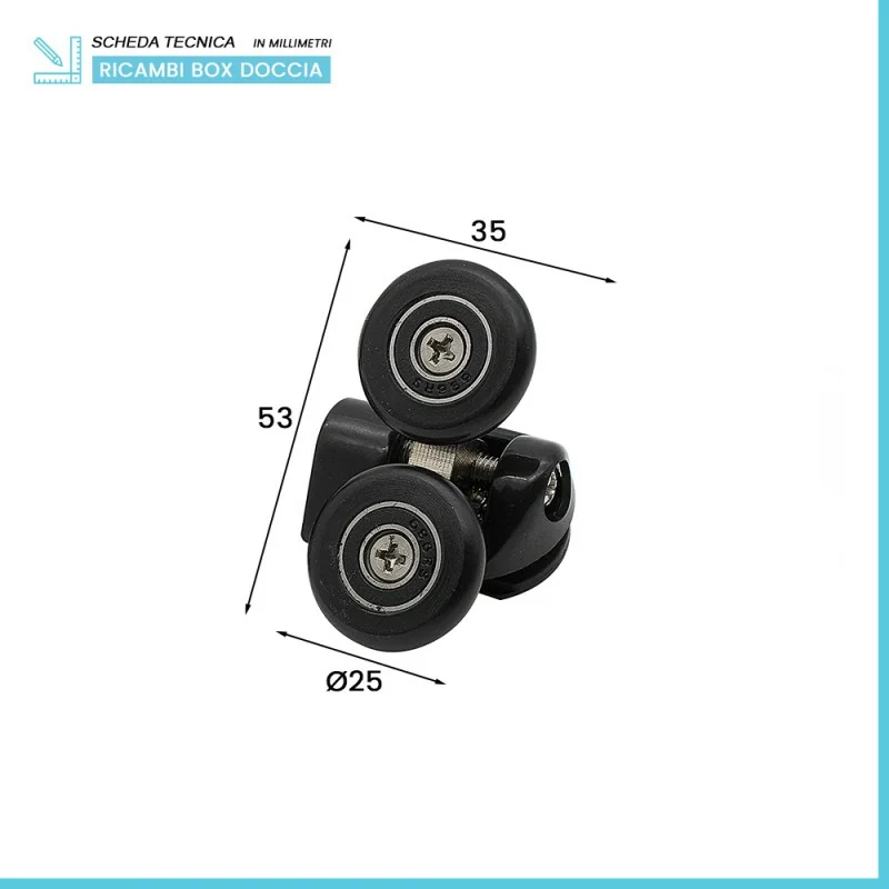 Il set include due ruote superiori universali per tutti i box doccia scorrevoli con vetro 5-6 mm,realizzate in ABS con finitura nero opaco. Il kit è progettato per risolvere il malfunzionamento delle ante scorrevoli:sostituendo facilmente i cuscinetti e le rotelle,le ante del box doccia riprenderanno a scorrere senza ostacoli.
