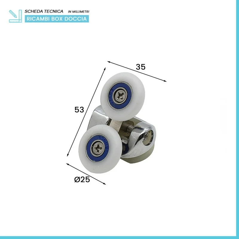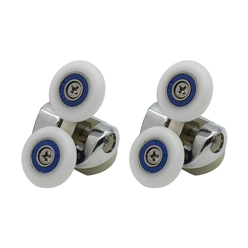 Il set include due ruote superiori universali per tutti i box doccia scorrevoli con vetro 5-6 mm,realizzate in ABS con finitura cromato lucido. Il kit è progettato per risolvere il malfunzionamento delle ante scorrevoli:sostituendo facilmente i cuscinetti e le rotelle,le ante del box doccia riprenderanno a scorrere senza ostacoli.