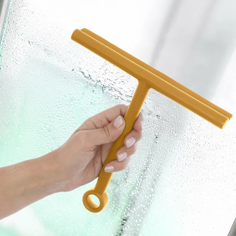 Spatola tergivetro per doccia con gomma antigraffio e manico ergonomico, disponibile in diversi colori