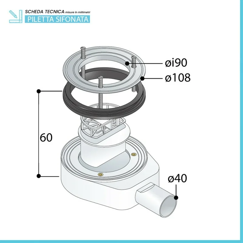 Piletta sifonata in PP bianco per piatto doccia con foro D. 90  cm Scheda tecnica Piletta sifonata in PP bianco per piatto doccia con foro D. 90  cm