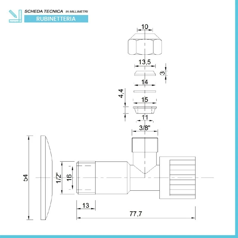 Questo rubinetto sottolavabo ha un attacco da 1/2” x 10 mm, ha inoltre la calotta removibile per utilizzarlo con attacco 1/2” e 3/8”.