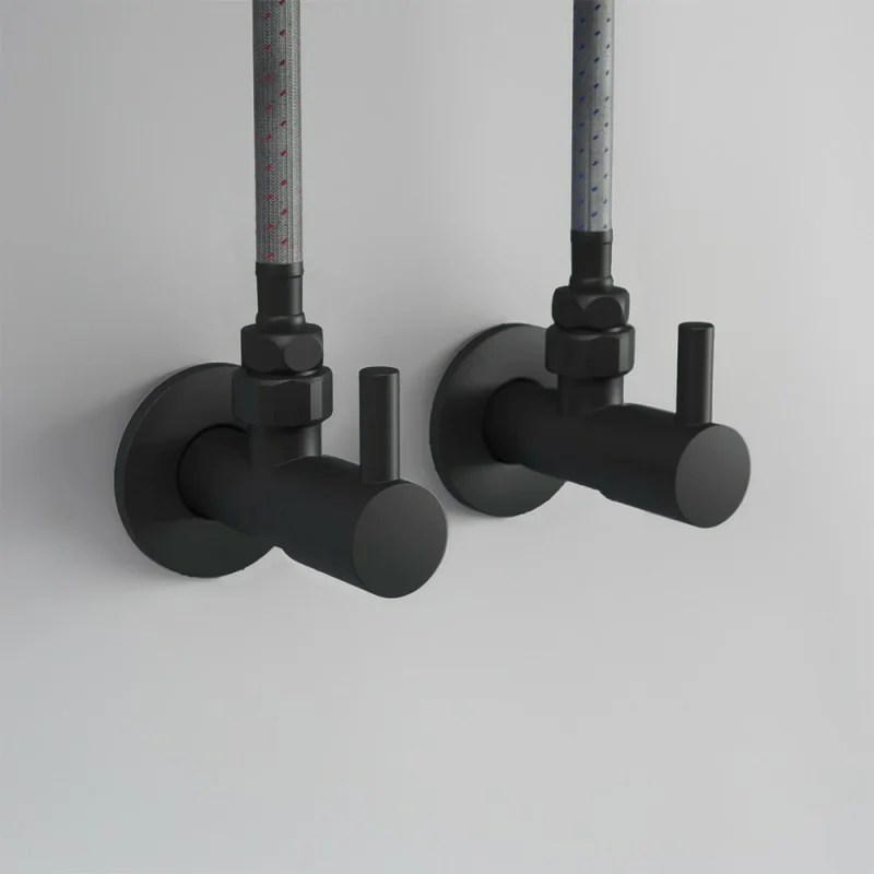 Eleganti valvole d’arresto sottolavabo in confezione da 2 pezzi in ottone massiccio, un design tondo con finitura nero opaco che completa l’arredo bagno in modo differente.