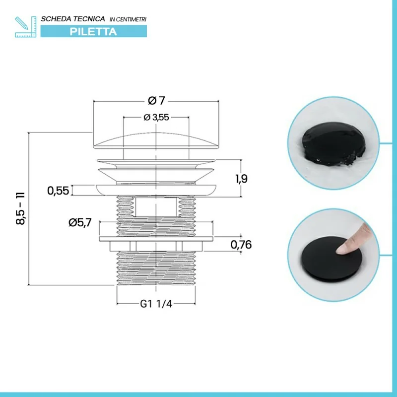 Piletta di scarico clic clac nera opaca con e senza troppopieno scheda tecnica Piletta di scarico clic clac nera opaca con e senza troppopieno Dettaglio sistema di scarico clic clac nera opaca con e senza troppopieno