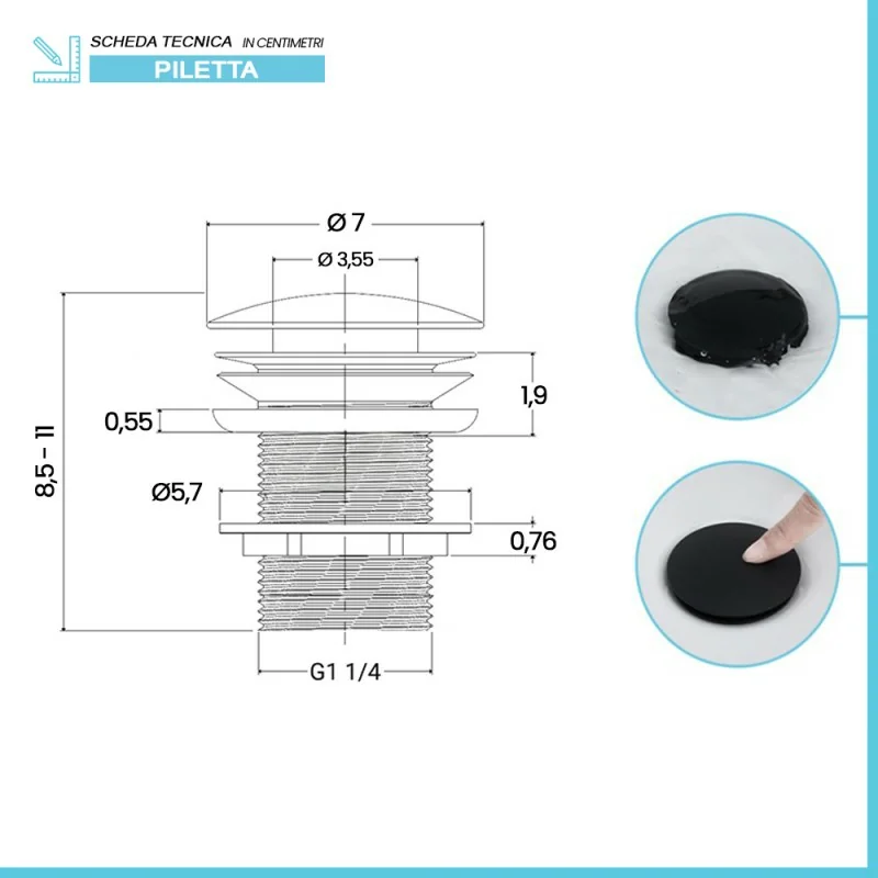 Con questa fantastica piletta click clack puoi gestire lo scarico in maniera elegante e funzionale. La struttura è realizzata in acciaio resistente alla corrosione con tappo in ceramica dal colore nero opaco. Si apre e si chiude semplicemente con una leggera pressione sulla stessa e può essere utilizzata tranquillamente con qualsiasi lavabo senza il foro troppo pieno.