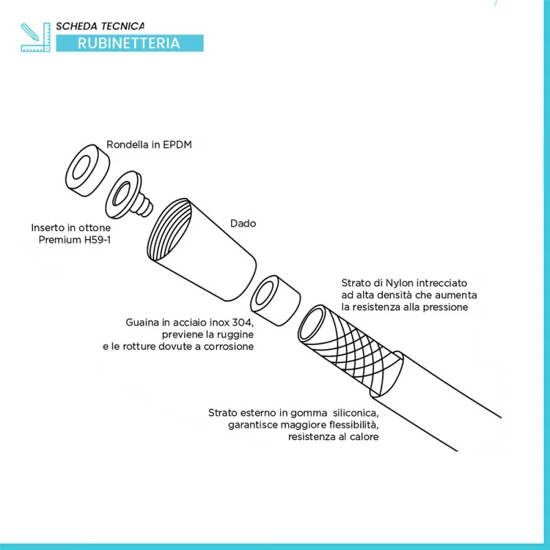 Il laccio doccia in silicone nero antitorsione dispone di uno strato di nylon intrecciato che aumenta la resistenza alla pressione e uno strato esterno in gomma che resiste meglio al calore. Vi è anche presente una guaina in acciaio inox che previene la ruggine. Il flessibile è lungo 150 cm, confortevole all’uso.