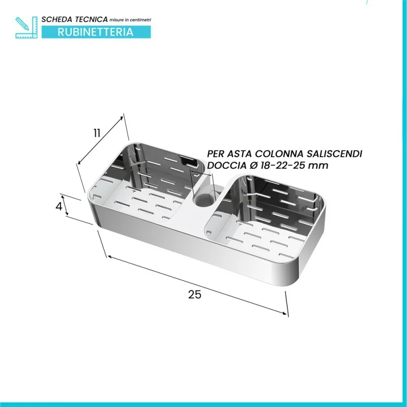 Portaoggetti per asta saliscendi L 25 cm in ABS cromo anticalcare con foro Ø 18, 22, 25