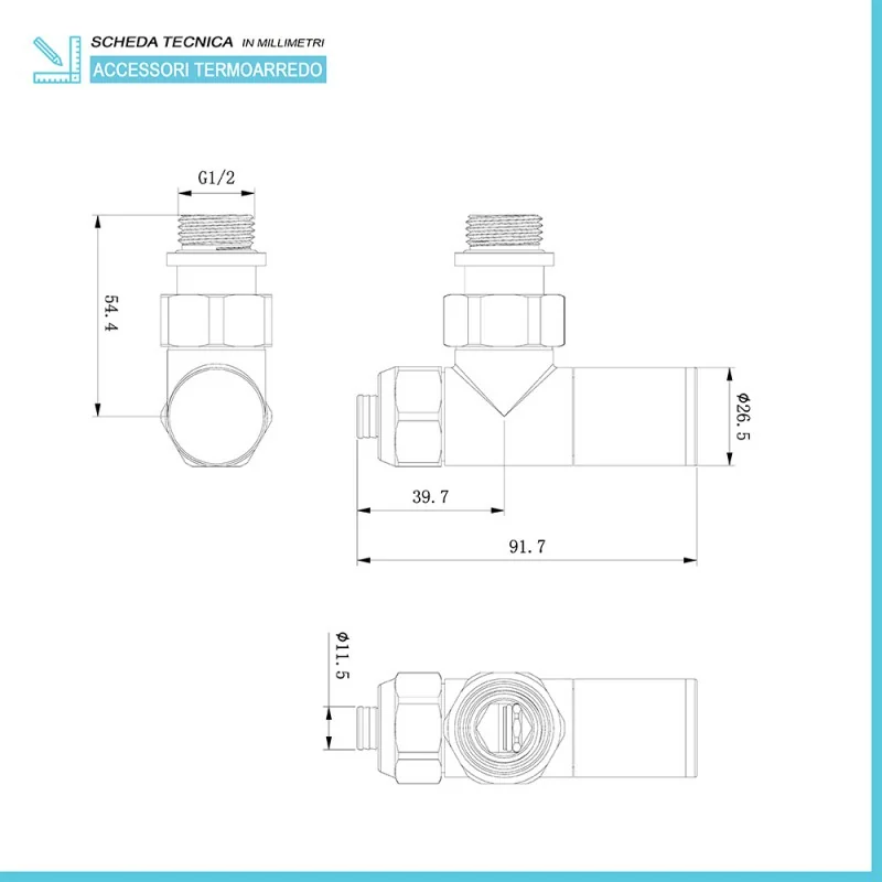 Entrambe le valvole sono completate dall'apposito raccordo per tubo rame,che da come avrete sicuramente intuito,consente di inserire e connettere correttamente il tubo di collegamento in rame da 12 mm alla valvola desiderata. L'attacco standard universale G 1/2 delle valvole per termoarredo permette di configurarle con qualsiasi scaldasalviette presente in circolazione.