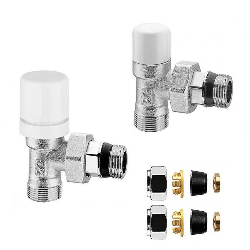 Valvola e detentore per termoarredo universali G 1/2" in acciaio con tappo bianco e raccordi per tubi in rame da 14 mm