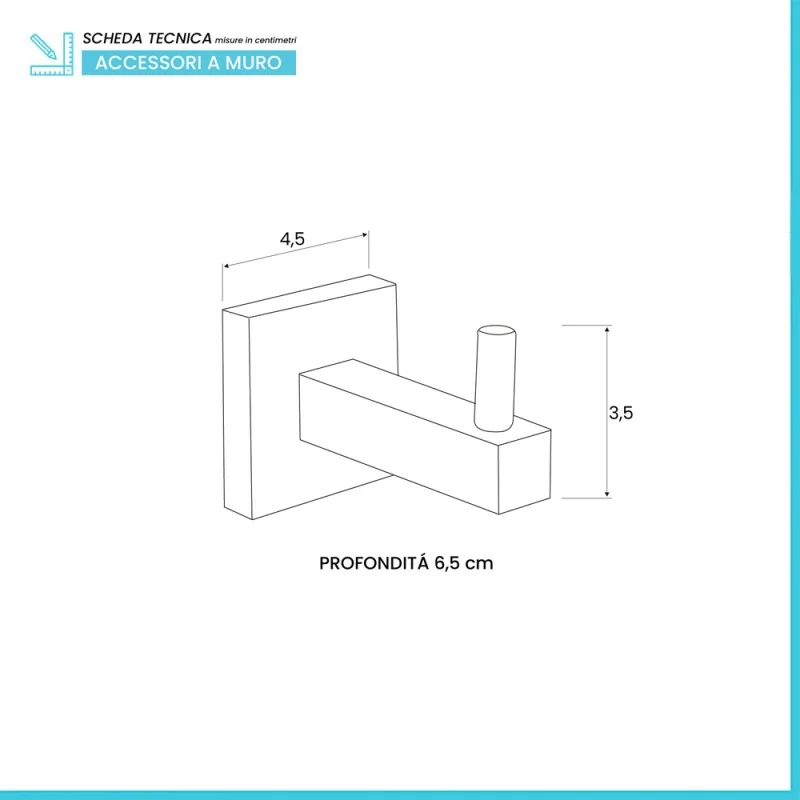 L’ appendino è interamente realizzato in metallo cromato con una semplice applicazione a muro compresa di viti. Completano l’acquisto accessori complementari della stessa linea:portaspazzolino,dispenser portasapone,portasciugamani,portarotolo.