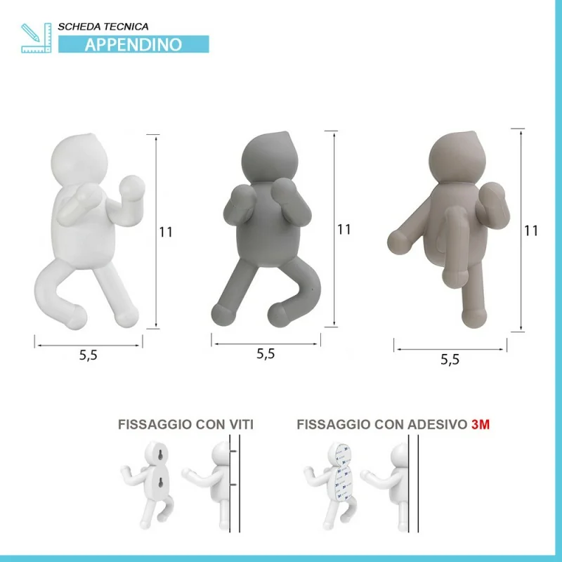 Bruce è l’appendino a forma di omino,dalle linee morbide e allo stesso tempo simpatiche;si presenta in posizioni diverse,in modo da creare sulla parete un motivo originale e dinamico,lasciando a chi installa la libertà di scegliere la posizione che preferisce.