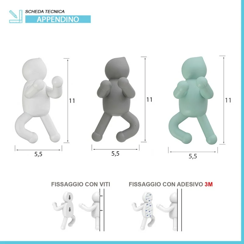 Bruce è l’appendino a forma di omino,dalle linee morbide e allo stesso tempo simpatiche;si presenta in posizioni diverse,in modo da creare sulla parete un motivo originale e dinamico,lasciando a chi installa la libertà di scegliere la posizione che preferisce.