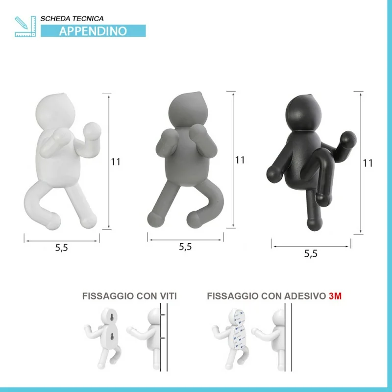 Set appendini 3 pezzi da parete in ABS con doppia installazione a muro con viti incluse o adesivo 3M