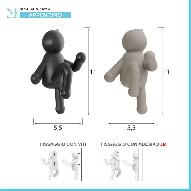 Bruce è l’appendino a forma di omino, dalle linee morbide e allo stesso tempo simpatiche; si presenta in posizioni diverse, in modo da creare sulla parete un motivo originale e dinamico, lasciando a chi installa la libertà di scegliere la posizione che preferisce.