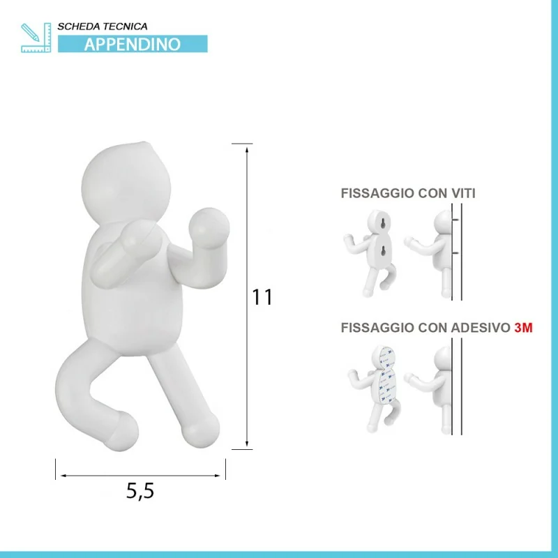 Appendino da parete a forma di omino con montaggio a parete e viti incluse o con adesivo 3M