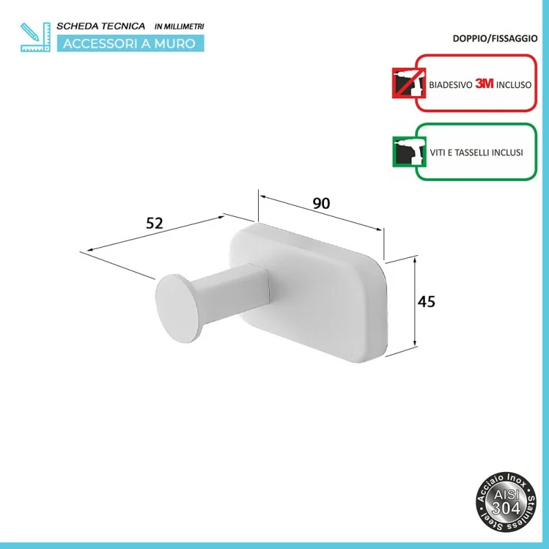 Set 2 appendini portasciugamani in acciaio inox bianco con doppio fissaggio Scheda tecnica Set 2 appendini portasciugamani in acciaio inox bianco con doppio fissaggio Render Set cubik