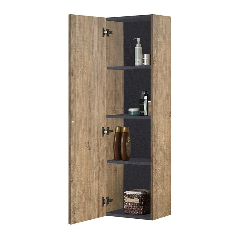 Il pensile bagno è progettato in legno melaminico particolarmente resistente ai graffi e dispone di apertura push-pull e chiusura soft-close. La colonna viene consegnata già assemblata con anta reversibile,installabile scegliendone il verso di apertura in base alle proprie esigenze.