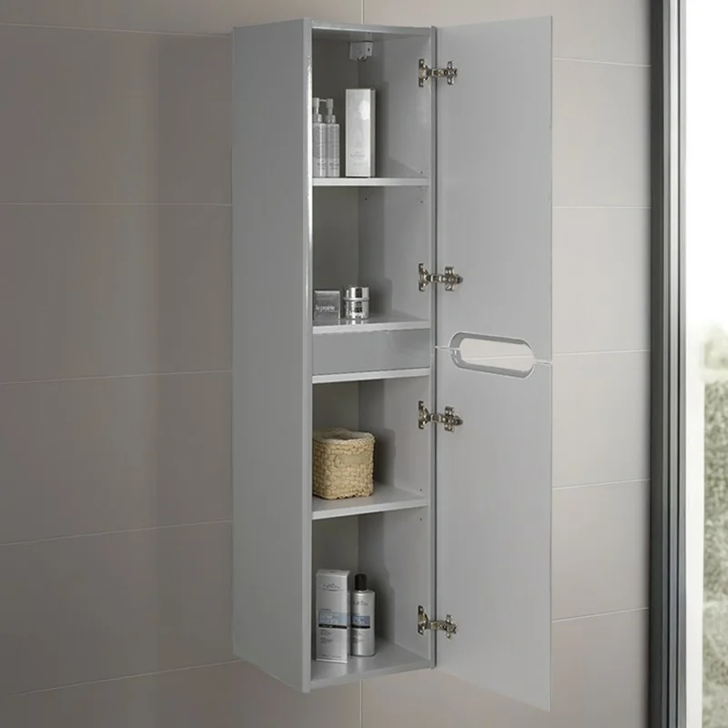 Colonna bagno sospesa 140 cm serie Stillo colore grigio lucido con 2 ante ad installazione reversibile e chiusura ammortizzata soft-close