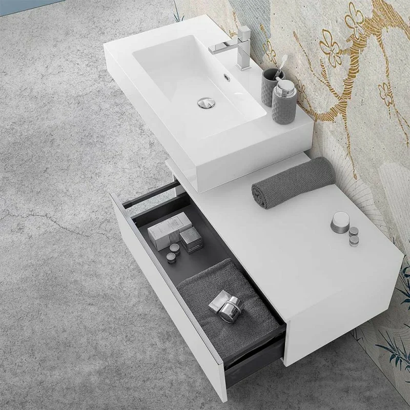La base sospesa 80 cm è dotato di un cassetto con apertura a gola,profilo cromato e chiusura soft-close,ideale per evitare danni accidentali dovuti a brusche chiusure. Lo stesso mobile sospeso è disponibile da 60 e da 80,con finitura bianco lucido,grigio perla e blu pastello.