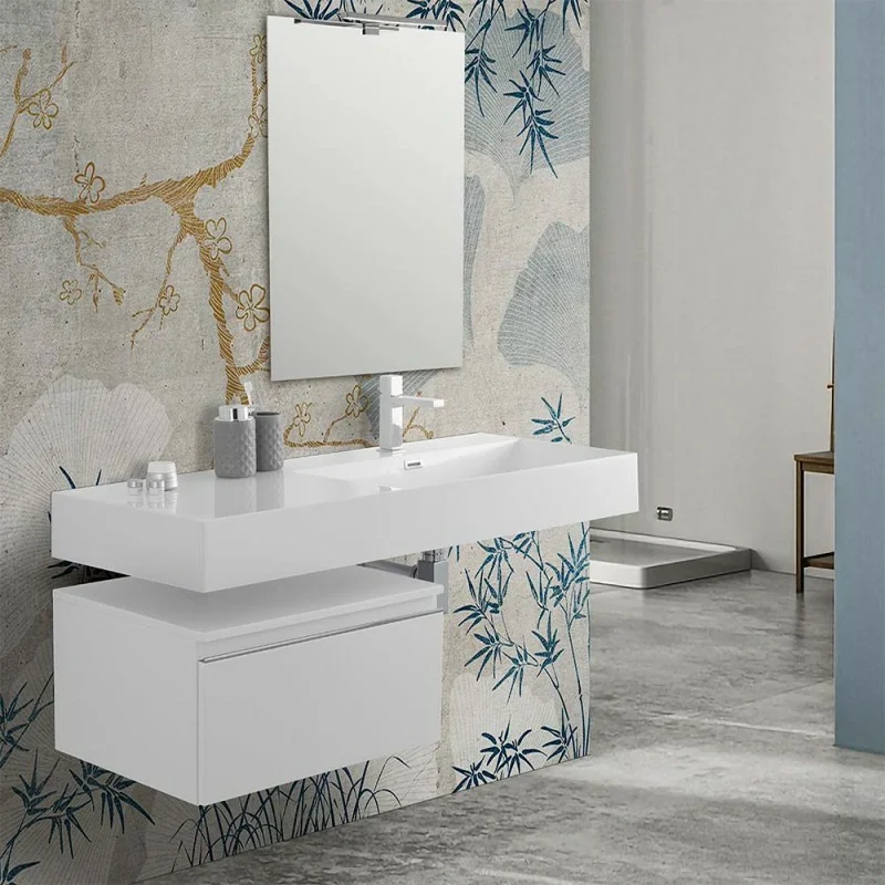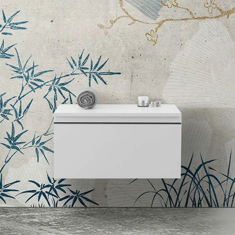 La base sospesa 80 cm è dotato di un cassetto con apertura a gola,profilo cromato e chiusura soft-close,ideale per evitare danni accidentali dovuti a brusche chiusure. Lo stesso mobile sospeso è disponibile da 60 e da 80,con finitura bianco lucido,grigio perla e blu pastello.