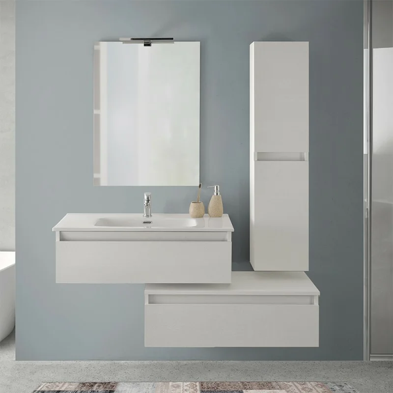 Pensile bagno sospeso in legno bianco con installazione reversibile e ripiani interni fissi