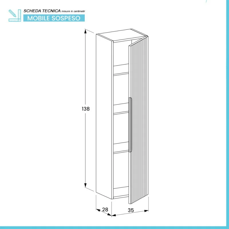 Pensile bagno sospeso H. 138 cm con anta cannettata chiusura soft close e ripiani interni Rigo