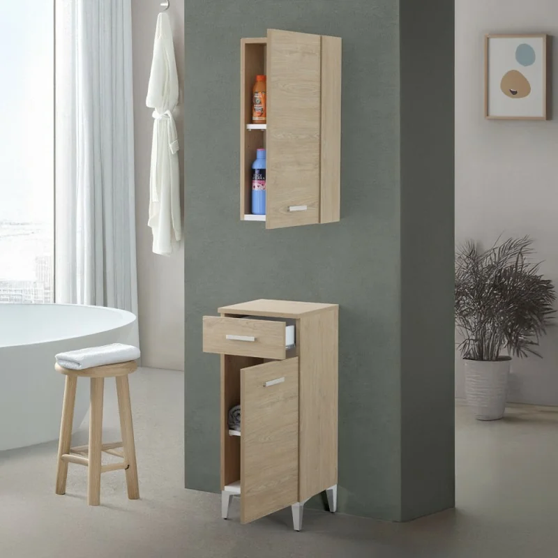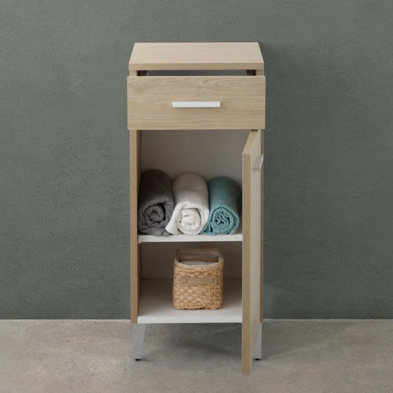 Realizzato in legno nobilitato da 18 mm, antigraffio e resistente, il mobile multiuso dispone di ripiano interno con mensola regolabile in altezza, anta reversibile con apertura da destra o da sinistra e cassetto scorrevole.