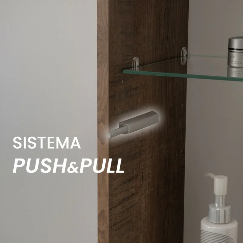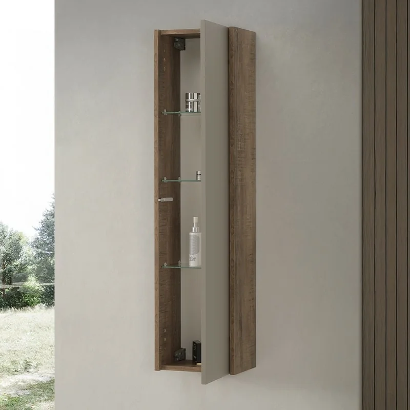 Pensile bagno sospeso da 30x120 cm in legno tabacco e tortora con ripiani in vetro e anta con sistema push-pull Linea Smok