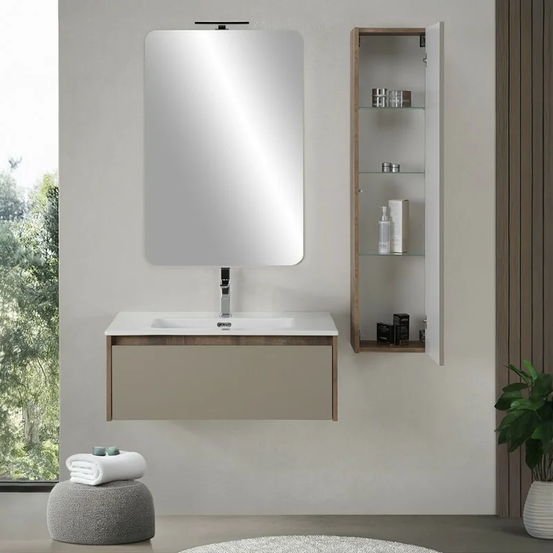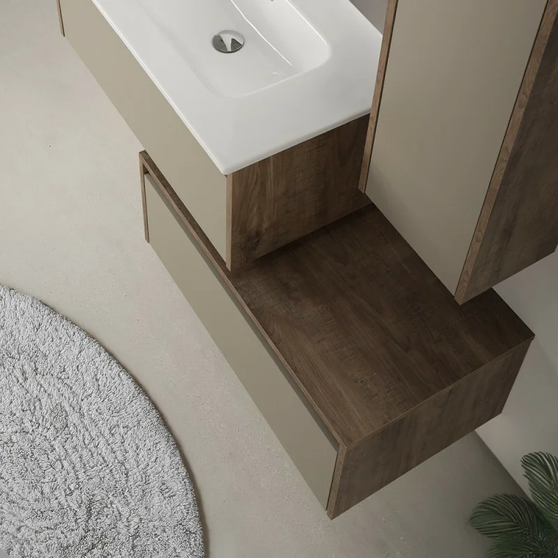 La linea Smok unisce il calore del legno all’eleganza della finitura tortora opaca creando una sensazione di accoglienza, calma e praticità nel tuo ambiente bagno.