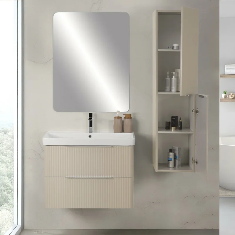 La colonna sospesa Mia completa l’arredo bagno con coerenza estetica e massima funzionalità. Il suo design lineare e la finitura crema cannettato la rendono perfettamente abbinabile al mobile della stessa linea, per un ambiente bagno elegante e armonioso.