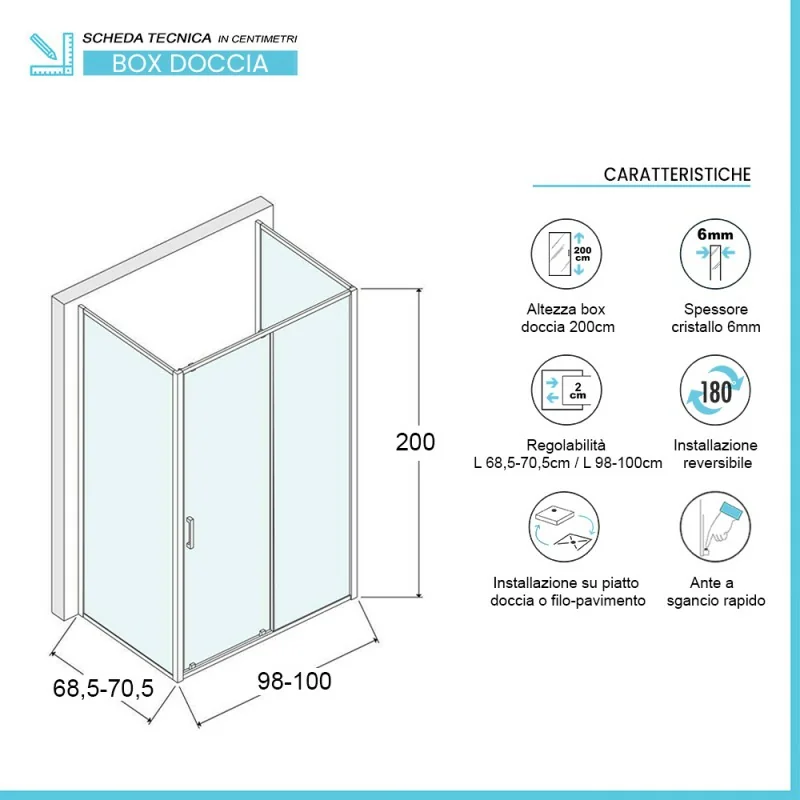 Box doccia 3 lati 70x100x70 cm caratteristiche tecniche: