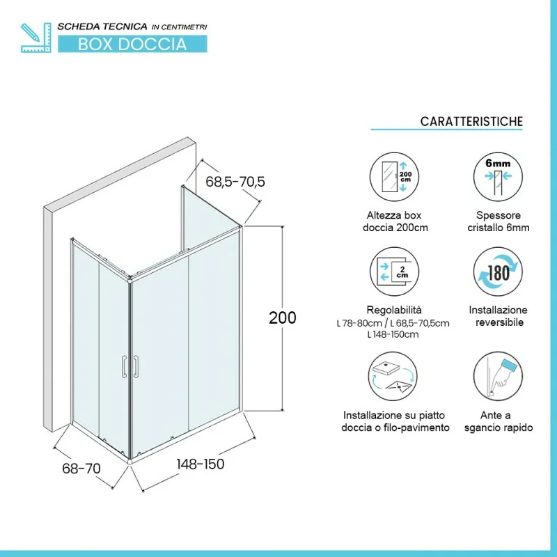 • Tipologia: Box doccia 3 lati con porta fissa e doppio scorrevole;