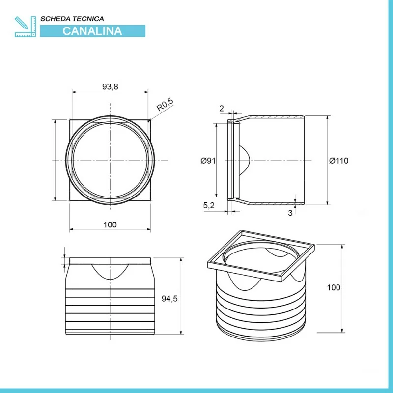 Questo modello è di forma quadrata,misura 10x10 cm ed è composta da un sifone ad incasso di altezza regolabile con un minimo di 56 mm ed una griglia superiore in acciaio inox AISI 304 cromato