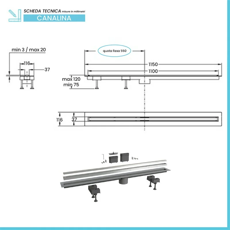 Canalina doccia 110 cm in alluminio reversibile con scarico laterale e piletta non inclusa Scheda tecnica Canalina doccia 110 cm in alluminio reversibile con scarico laterale e piletta non inclusa