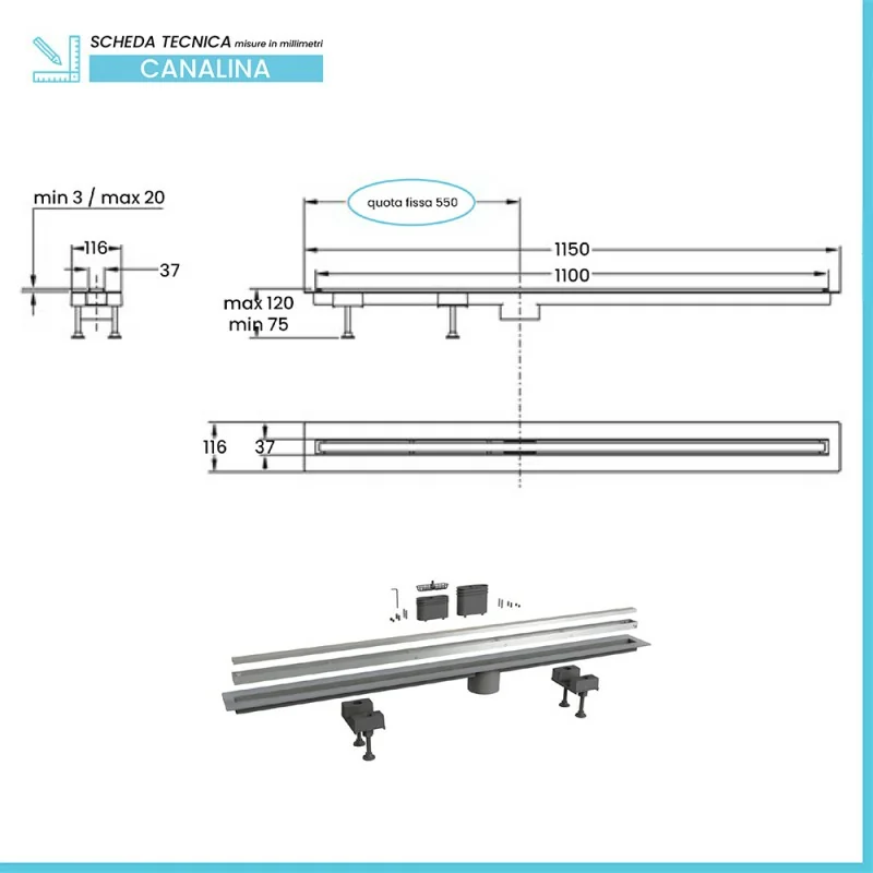 Canalina doccia 120 cm in alluminio reversibile con scarico laterale e piletta non inclusa Scheda tecnica Canalina doccia 120 cm in alluminio reversibile con scarico laterale e piletta non inclusa