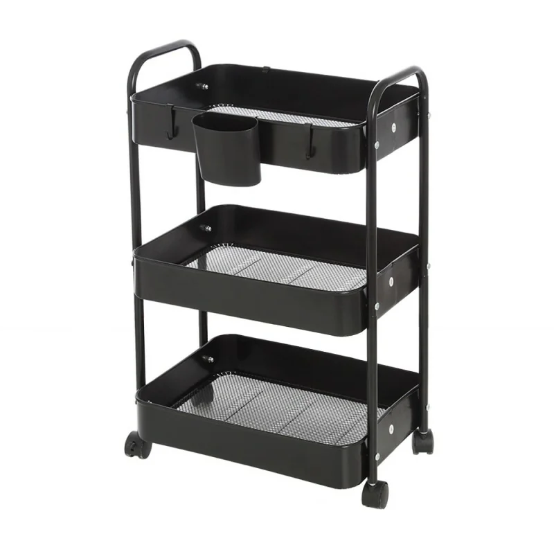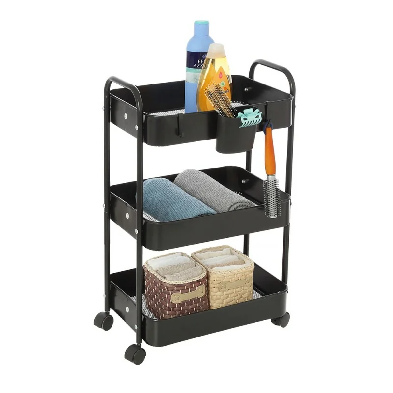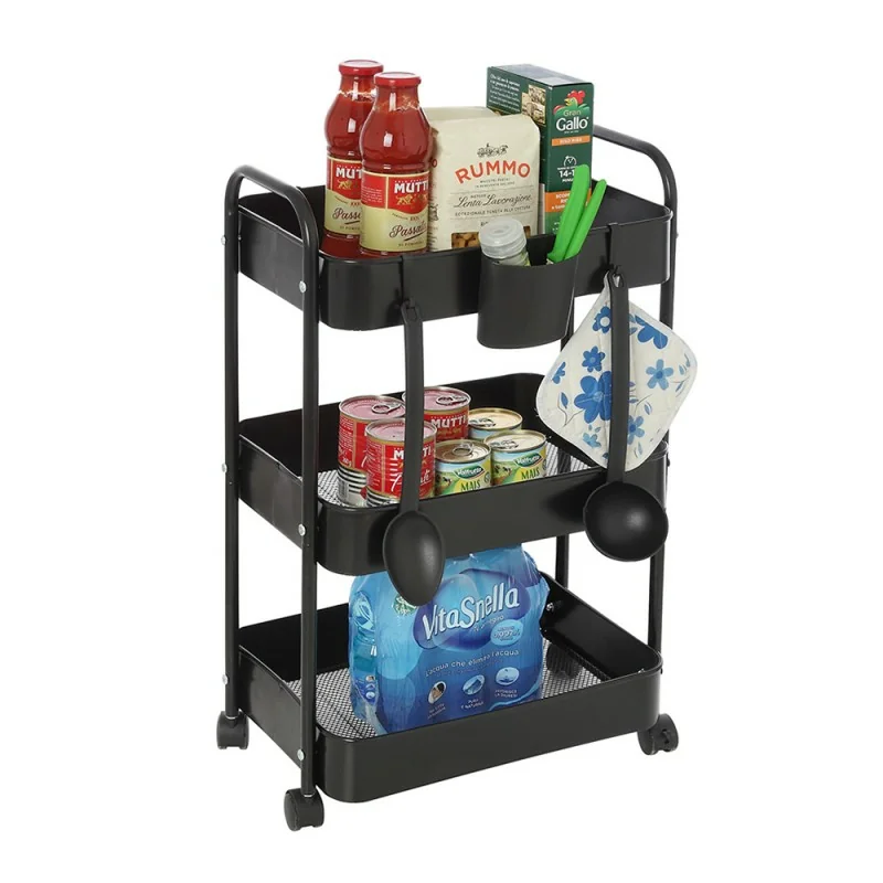 Il carrello dispone di ben 3 ripiani,ciascuno con una generosa portata massima di 5 kg;l’acquisto include 4 ganci ai laterali del carrello e un pratico cestello portaoggetti,ideale per riporre ulteriori accessori.