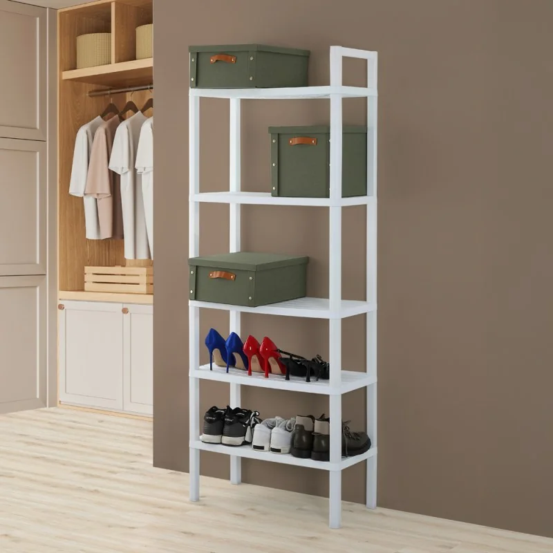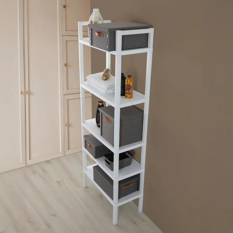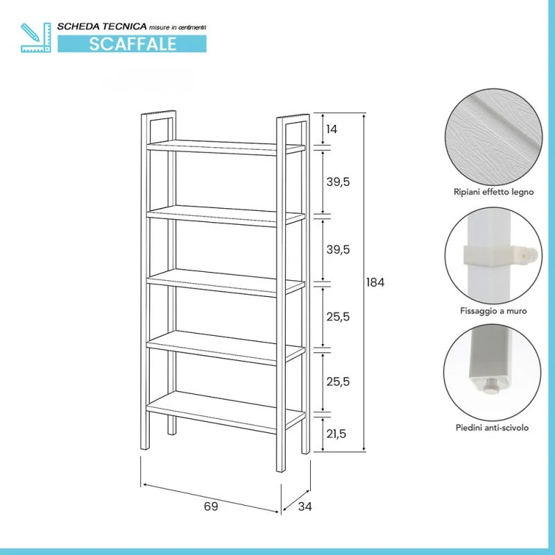 Con questo scaffale multiuso potrai organizzare al meglio la zona che preferisci  in pochi e semplici passi. Posizionabile ovunque, dispone di 5 ripiani in plastica dall’ effetto legno per l’organizzazione dei propri oggetti personali. E’ solido e resistente con appositi piedini da appoggio antiscivolo, ganci per fissaggio a muro per mantenere una posizione ferma e stabile ad ogni eventuale sollecito. Facile e veloce da montare, non serve l’uso di alcun attrezzo.