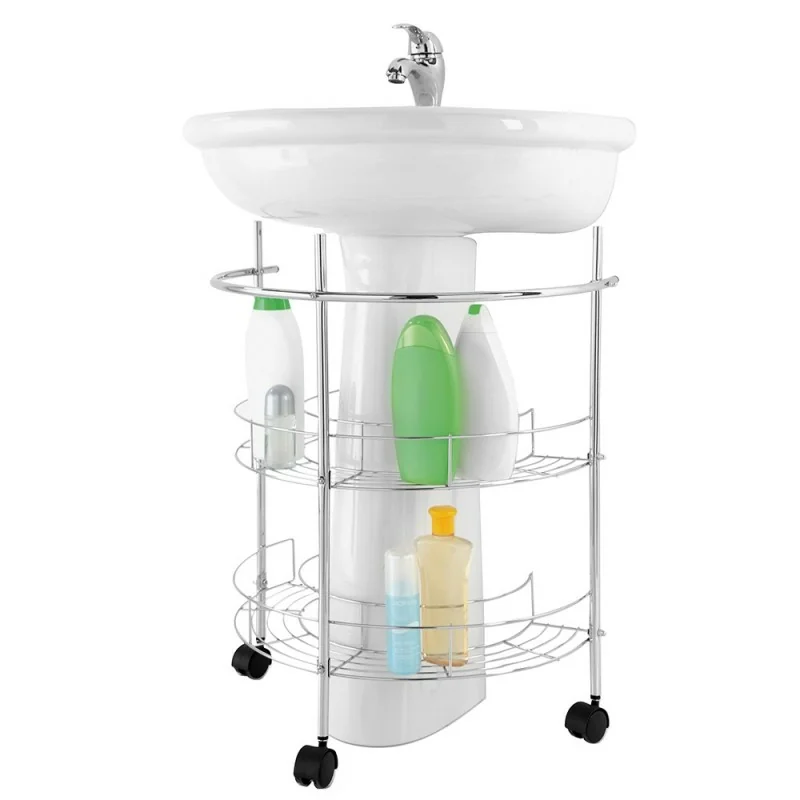 Carrello sottolavabo in acciaio cromato con 2 ripiani e rotelle Scaffale sottolavello bagno in acciaio cromato con 2 ripiani e rotelle girevoli