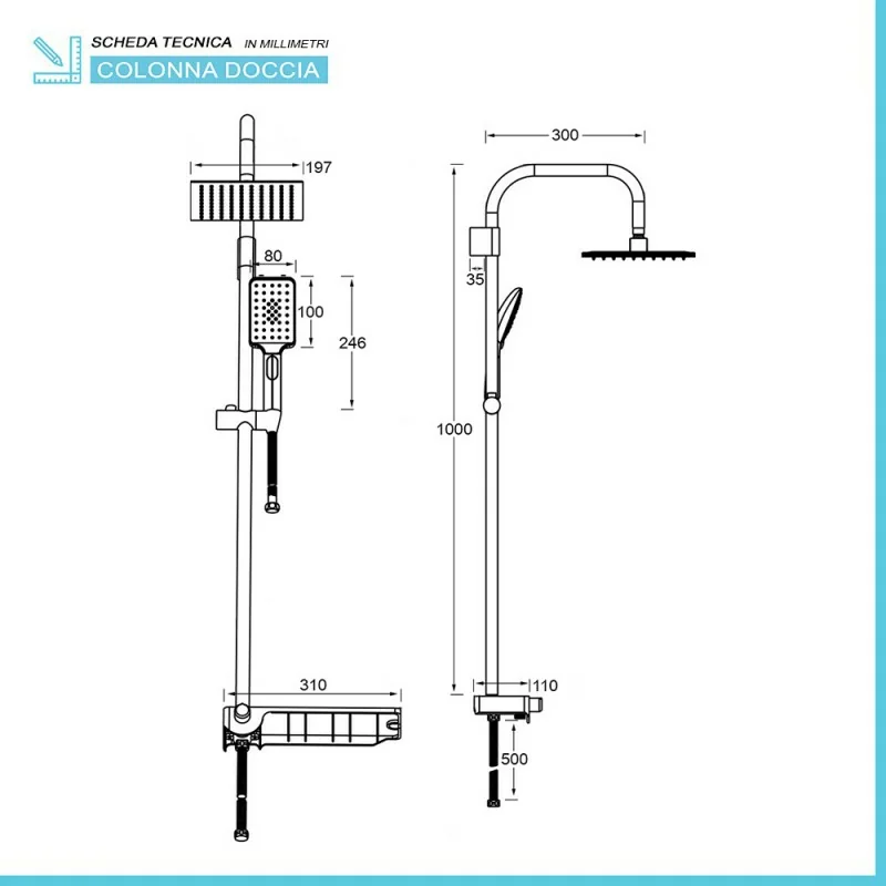 Questo sistema doccia ha un design particolarmente moderno,essendo dotata di soffione e doccetta quadrate. E' completa di un saliscendi con interasse regolabile in acciaio cromato (H 105 cm - Diam 22 mm). Un soffione 20x20 cm in ABS cromato con ugelli autopulenti e una doccetta in ABS cromato,dotata di tre funzioni,anch’essa con ugelli autopulenti.