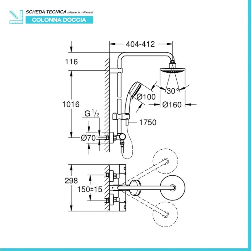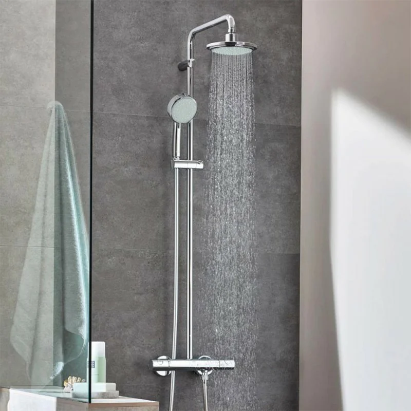 Questo sistema doccia di GROHE si compone di braccio doccia girevole, miscelatore termostatico esterno con aquadimmer, soffione doccia a getto fisso da 16 cm, manopola doccia a 2 getti e flessibile da 175 cm. I due getti sono rain,morbido e delicato,e jet,mirato ed energetico. La colonna doccia è caratterizzata da tecnologie che ottimizzano i consumi energetici e il comfort quotidiano come l'elemento termostatico GROHE Turbostat,la manopola graduata GROHE SafeStop,la tecnologia GROHE DreamSpray per un getto perfetto ed il sistema anticalcare SpeedClean.