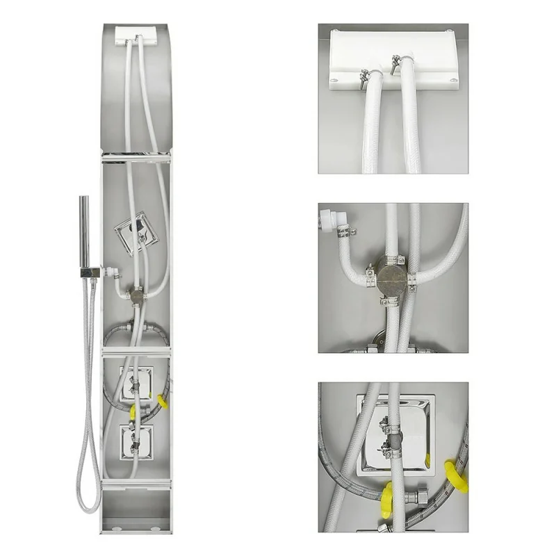 La colonna implementa 4 funzioni all'avanguardia:doccino cromato, soffione ,effetto cascata, getto orizzontale "massaggio". Il pannello doccia è realizzato in acciaio inox, molto resistente alle corrosioni e facile da pulire. La minuzia estetica del prodotto è direttamente proporzionale ai comfort offerti. Difatti sono inclusi il doccino in abs cromato e il laccio doccia da 150cm.