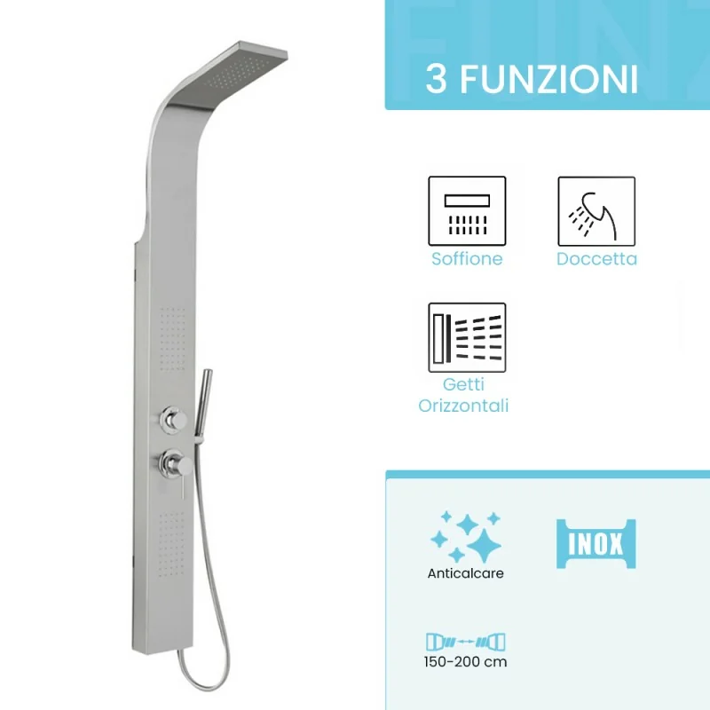 Pannello doccia multifunzione spazzolato con 3 getti in acciaio inox