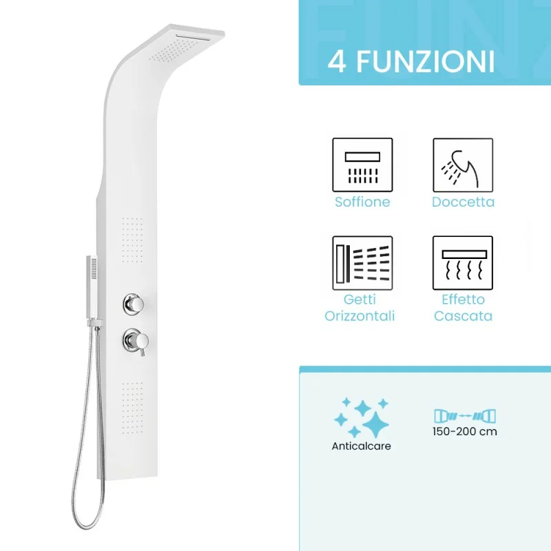 Elegante e funzionale,questo pannello doccia è un vero e proprio centro benessere per il tuo bagno. Realizzato in alluminio resistente all’usura nel tempo,presenta 4 comode funzioni azionabili dall’apposito deviatore selettore:soffione,getto effetto cascata,doccino e getti orizzontali massage. L’installazione semplice e veloce non comporta onerosi interventi di muratura,basta allacciare la colonna doccia al proprio impianto idraulico e il gioco è fatto.