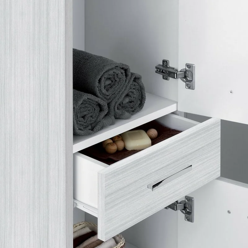 Realizzato in legno nobilitato da 18 mm,antigraffio e resistente,la colonna bagno multiuso dispone di cassetto scorrevole e due ante con ripiani interni e apertura mediante maniglie cromate.