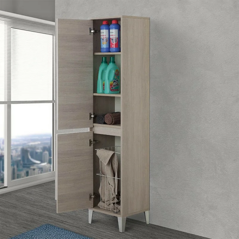 La colonna portabiancheria apporta un profondo valore aggiunto al proprio arredo bagno,donandogli maggiore spazio a disposizione per la propria oggettistica e un vano ad hoc dove riporre comodamente tutta la propria biancheria sporca. Il pensile è realizzato in legno melaminico dallo spessore di 18 mm,altamente resistente ad urti e impatti,con innovativa superficie antigraffio. L'armadio bagno è composto da 2 ante ad installazione reversibile con chiusura ammortizzata soft close,utile ad ammortizzare l'effetto sortito da colpi accidentali,e sistema di apertura a gola con maniglie integrate direttamente sul frontale del mobile. Sono inoltre presenti 2 ripiani interni regolabili,posizionabili liberamente in base ad ogni esigenza e bisogno.