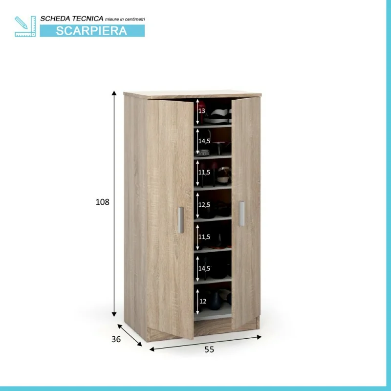 Mobile scarpiera H 108 rovere canadese in legno con 2 ante e 6 ripiani